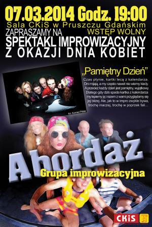 Serdecznie zapraszamy na spektakl improwizacyjny z okazji Dnia Kobiet, który odbędzie się 07.03.2014 r. (piątek) o godzinie 19:00 w Centrum Kultury i Sportu w Pruszczu Gdańskim. Tym razem do łez rozbawi Państwa grupa Abordaż. Wstęp bezpłatny. Szczegóły na plakacie.