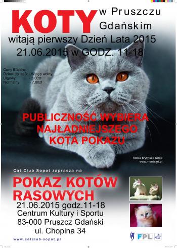 Zarząd Cat Club Sopot i Zespół Organizacyjny Pokazu serdecznie zaprasza na Pokaz Kotów Rasowych i Domowych. Pokaz odbędzie się w dniu 21.06.2015 w godz. 11.00 do 18.00 Centrum Kultury i Sportu ul. Chopina 34 83-000 Pruszcz Gdański.