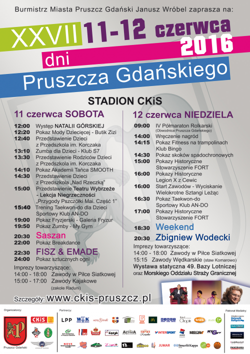 W drugi weekend czerwca, rozpoczynają się XXVII Dni Pruszcza Gdańskiego. W tym roku postanowiliśmy przełamać nieco formułę i zaskoczyć mieszkańców. Na początek na scenie zaprezentują się dzieci z pruszczańskich przedszkoli, a także członkowie sekcji Centrum Kultury i Sportu. Około godz. 15.00 najmłodsi będą mieli okazję uczestniczyć w „Lekcji Niegrzeczności” Teatru Wybrzeże. Około godziny 20.00 na stadionie Centrum Kultury i Sportu wystąpi popularna Saszan, czyli Roksana Pindor. 21-letnia wokalistka znana jest z hitów takich jak „Wybrałam” czy „Świat jest nasz”. Po młodej gwieździe wystąpią Fisz Emade jako Tworzywo, czyli bracia Piotr i Bartosz Waglewscy.