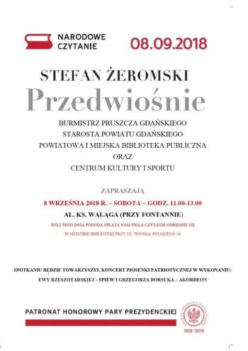 Zapraszamy na Narodowe Czytanie "Przedwiośnia" Stefana Żeromskiego, które odbędzie się 8 września 2018 r. o godz.11:00 - 13:00, Al. Ks. Waląga (przy fontannie) w Pruszczu Gdańskim.