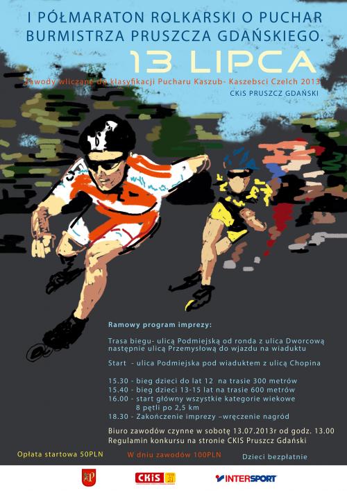 W dniu 13 lipca 2013 roku w Pruszczu Gdańskim odbędzie się I Półmaraton Rolkarski o Puchar Burmistrza Pruszcza Gdańskiego. Zawody są wliczane do klasyfikacji Pucharu Kaszub. Impreza ma na celu krzewienie kultury fizycznej wśród dzieci, młodzieży i dorosłych, a także promowanie terenów Pruszcza Gdańskiego. Półmaraton odbędzie się na trasie ok. 20 km i przebiegnie ulicą Podmiejską oraz częściowo ulicą Przemysłową. Start i meta na ulicy Podmiejskiej nieopodal wiaduktu drogowego pod ulicą Chopina. Biegi odbędą się w dwóch kategoriach dziecięcych: do 12 lat wspólnie chłopcy i dziewczęta – start wspólny, dzieci 13 do 16 lat również wspólnie chłopcy i dziewczęta oraz klasyfikacja generalna kobiet i mężczyzn – start wspólny.