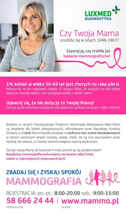 „Mimo, iż mammografia to najskuteczniejsza metoda profilaktyki raka piersi, nadal mniej niż połowa kobiet poddała się bezpłatnemu badaniu w ramach Populacyjnego Programu Wczesnego Wykrywania Raka Piersi – mówi dr Małgorzata Cymerman z LUX MED Diagnostyka – Zachęcamy panie do profilaktyki związanej z rakiem piersi, gdyż jest to najczęściej występujący nowotwór złośliwy wśród Polek.”