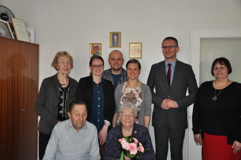 Pięknego jubileuszu gratulował Burmistrz Janusz Wróbel wraz z Przewodniczącą Rady Miasta Małgorzatą Czarnecką – Szafrańską. Władze miasta złożyły najserdeczniejsze życzenia urodzinowe, wręczając prezent, kwiaty i list gratulacyjny.
