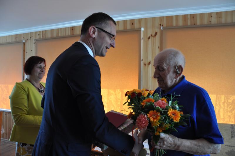 Z tej okazji przedstawiciele władz miasta, Burmistrz Janusz Wróbel oraz Przewodnicząca Rady Miasta Małgorzata Czarnecka - Szafrańska odwiedzili dostojnego Jubilata, aby złożyć najserdeczniejsze życzenia, wręczyć prezent, kwiaty i list gratulacyjny.
