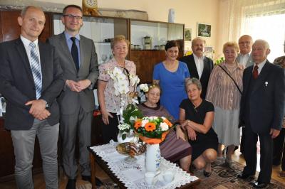 Pięknego jubileuszu gratulowali w dniu urodzin Burmistrz Pruszcza Gdańskiego - Janusz Wróbel wraz z Wiceprzewodniczącym Rady Miasta Ireneuszem Czerneckim. Z okazji wyjątkowej rocznicy Pani Danuta przyjęła życzenia, kwiaty i prezent od władz miasta.